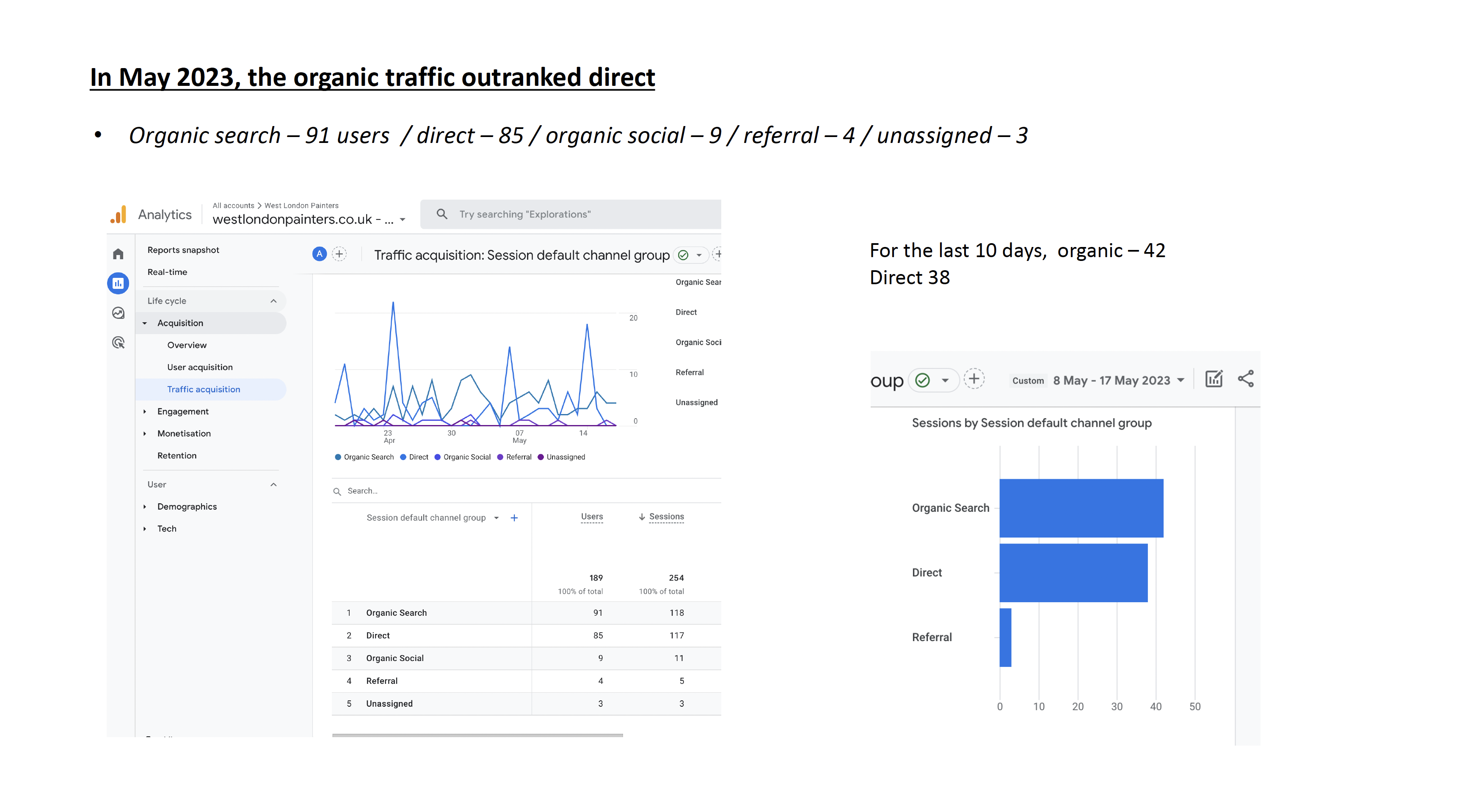 In May, organic traffic surpassed direct traffic in volume, marking a significant milestone in this website’s growth.